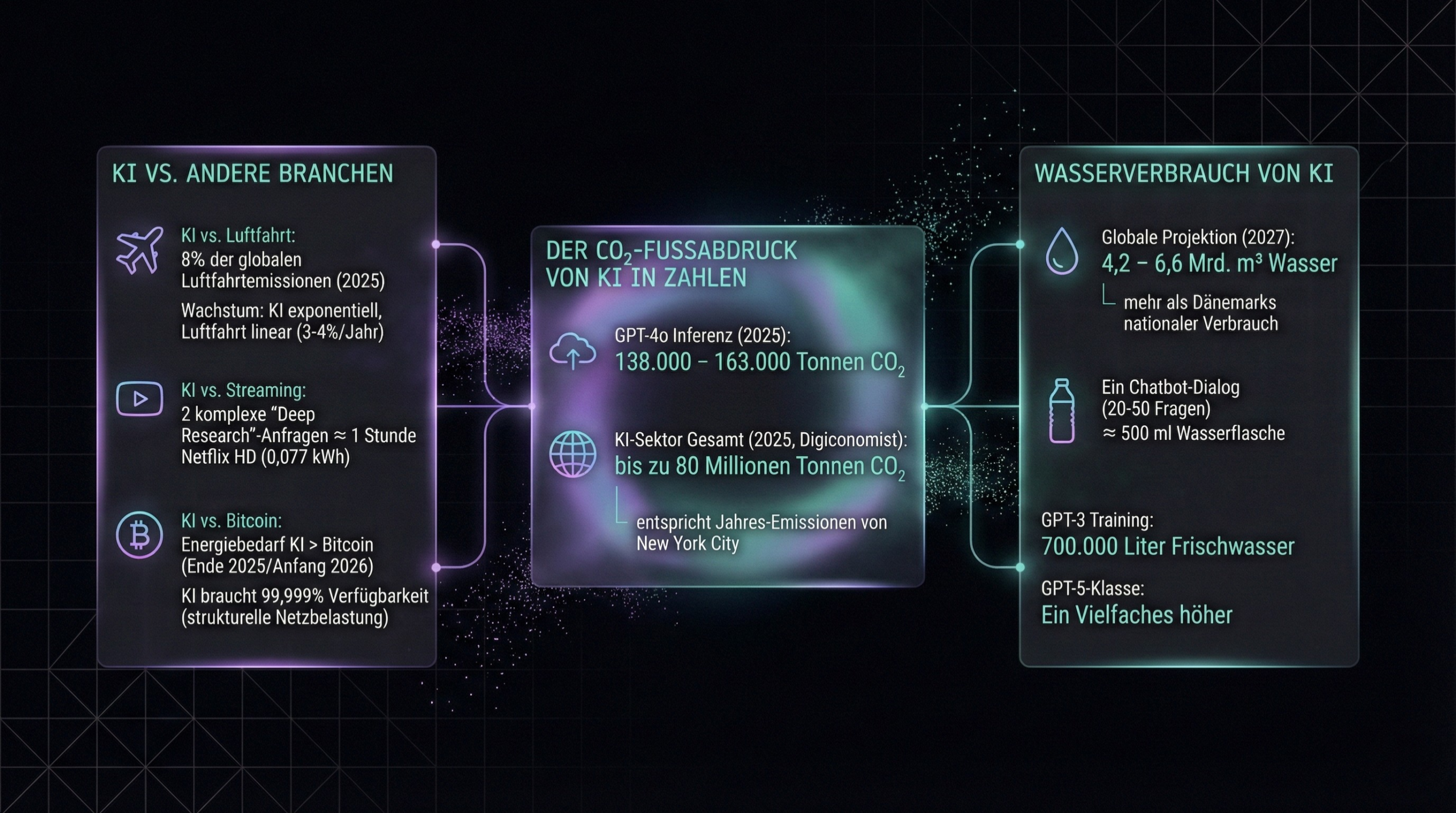Allein die Inferenz von GPT-4o verursachte 2025 geschätzt 138.000 bis 163.000 Tonnen CO₂. Der Forscher Alex de Vries (Digiconomist) schätzt die Gesamtemissionen des KI-Sektors für 2025 auf bis zu 80 Millionen Tonnen CO₂ – das entspricht den jährlichen Emissionen von ganz New York City.