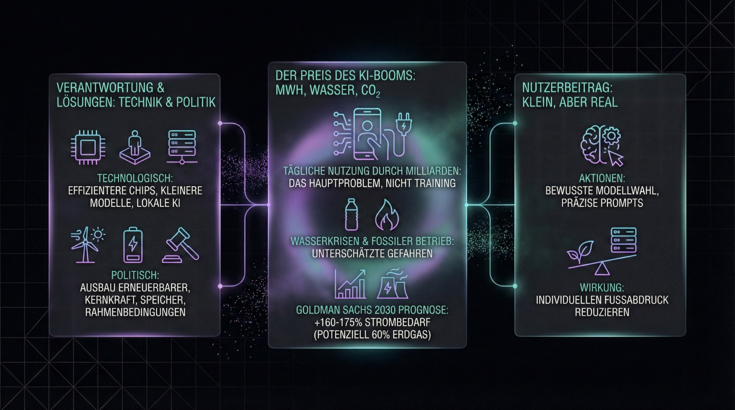 Drei Erkenntnisse sind dabei entscheidend: Erstens ist nicht das Training der Modelle das Kernproblem, sondern deren tägliche Nutzung durch Milliarden von Menschen. Zweitens ist Wasser mindestens so kritisch wie Strom – lokale Auswirkungen auf Gemeinden und Ökosysteme werden oft unterschätzt. Und drittens braucht es sowohl technologische Lösungen (effizientere Chips, kleinere Modelle, lokale KI) als auch politische Rahmenbedingungen, die verhindern, dass die Intelligenz der Zukunft mit den fossilen Brennstoffen der Vergangenheit betrieben wird.