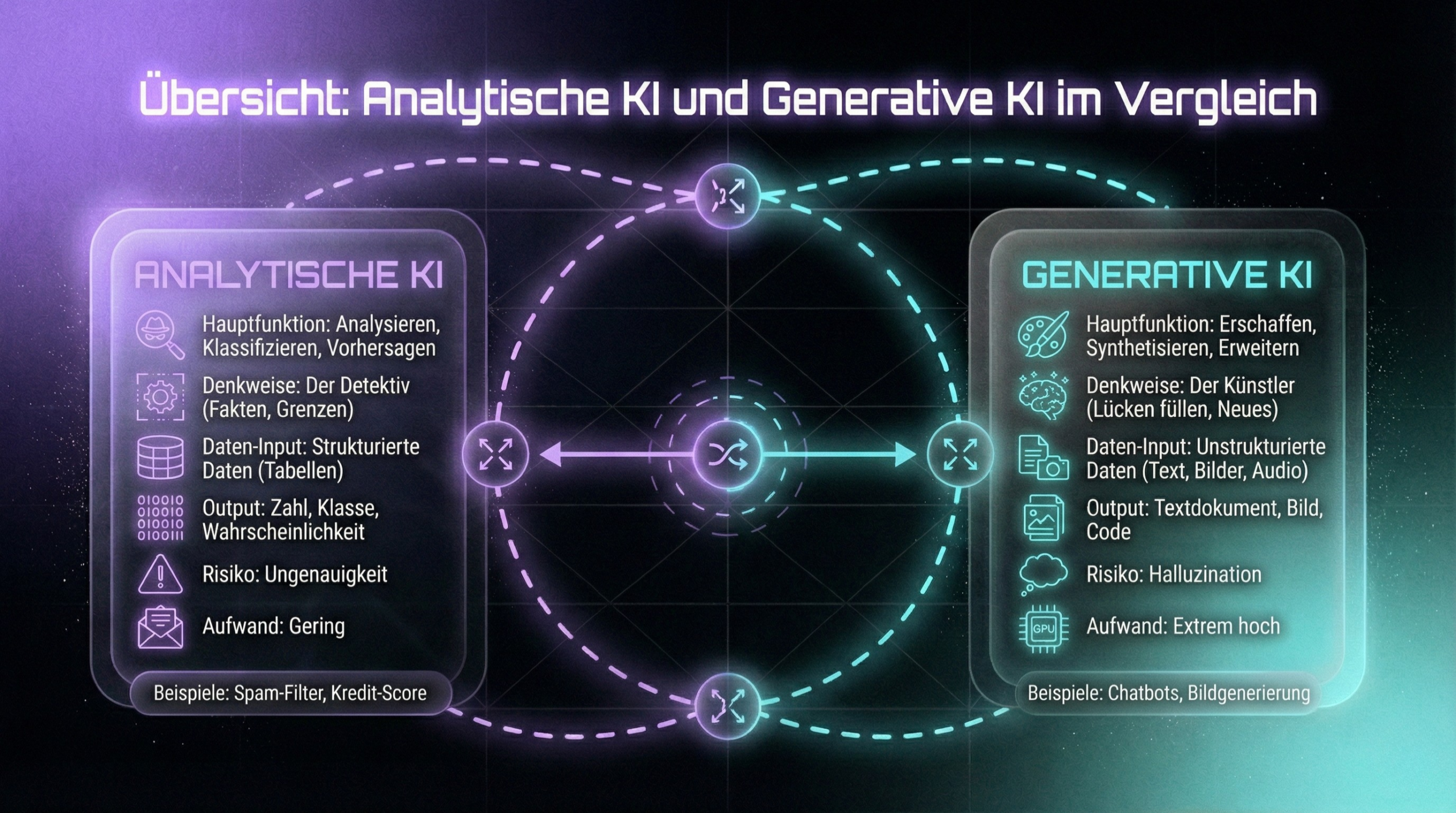 Analytische KI analysiert Daten, erkennt Muster und trifft Vorhersagen. Generative KI erschafft neue Inhalte – Texte, Bilder, Code, Musik. Beide basieren auf maschinellem Lernen, lösen aber grundverschiedene Probleme.