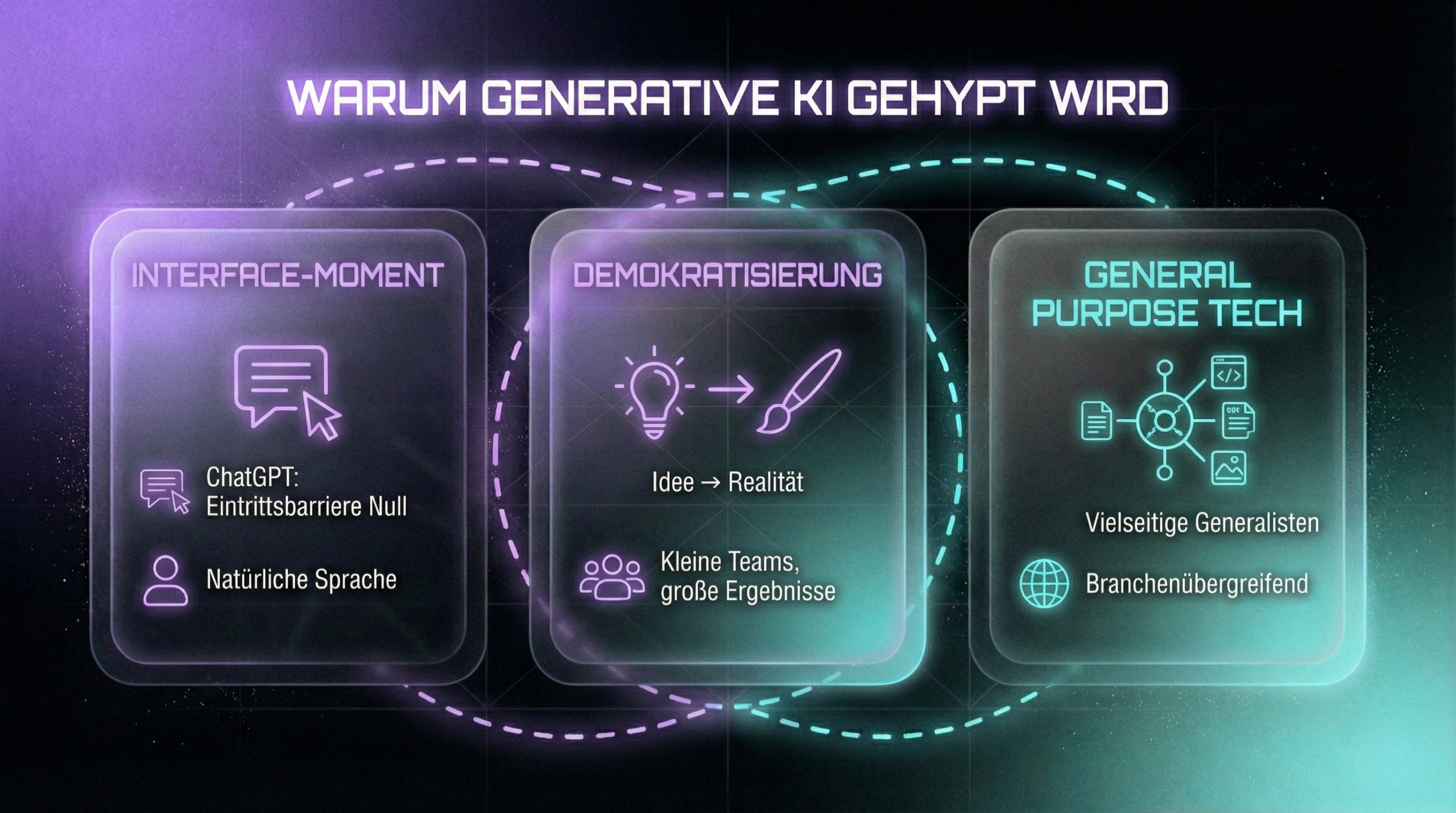 Warum ist generative KI gerade jetzt so populär? Drei Faktoren treffen zusammen: Erstens der Interface-Moment durch ChatGPT Ende 2022, der KI für jeden zugänglich machte. Zweitens die Vielseitigkeit von LLMs als General Purpose Technology, die für fast jede Branche relevant ist. Drittens die Demokratisierung der Kreativität – wer eine Idee beschreiben kann, kann sie jetzt auch umsetzen lassen, ohne handwerkliche Spezialkenntnisse.