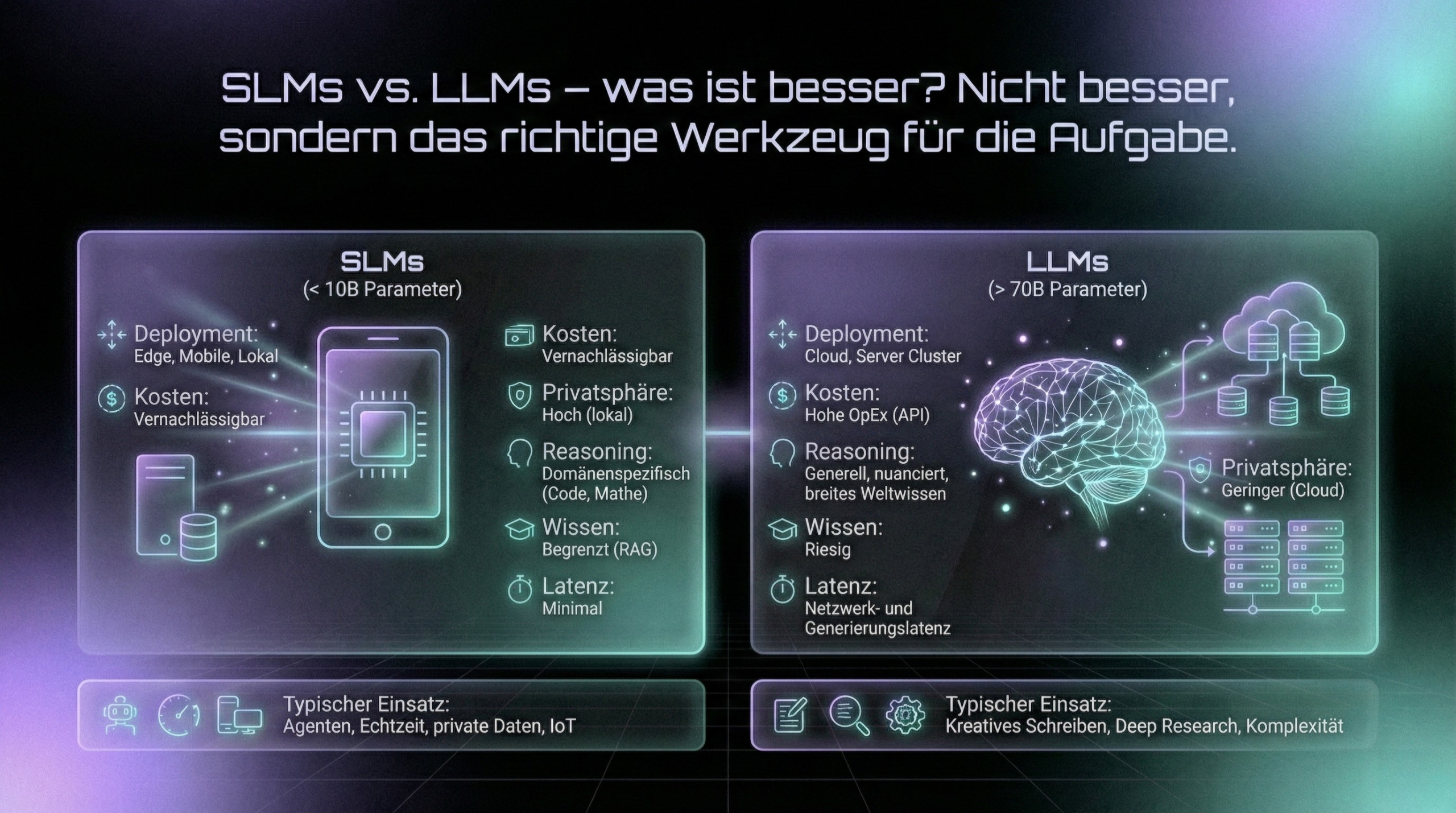 | Merkmal | SLMs (< 10B Parameter) | LLMs (> 70B Parameter) |