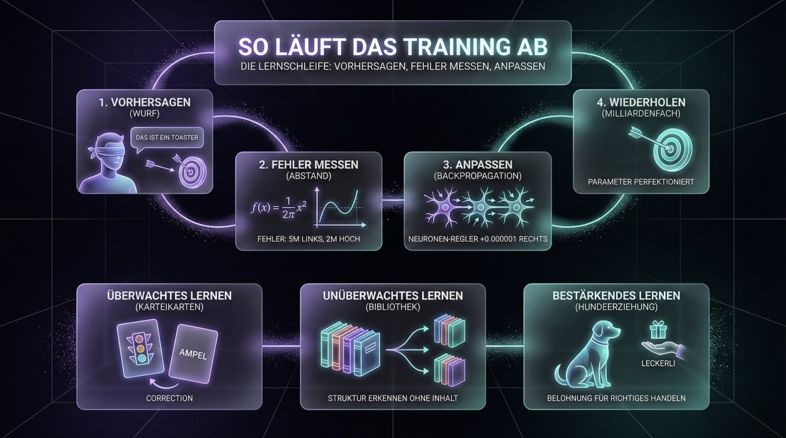 Stell dir die KI als Dartspieler mit verbundenen Augen vor. Das Bullseye ist die richtige Antwort. Der Lernprozess läuft in einer Endlosschleife: