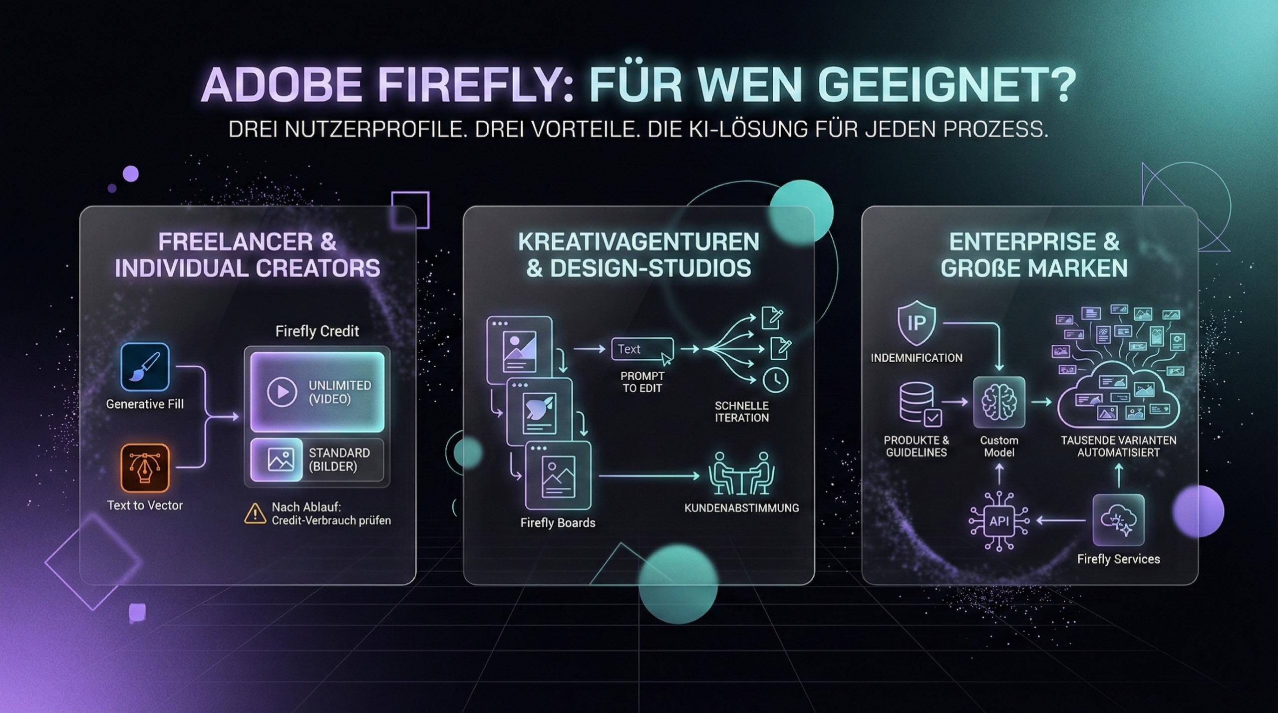 IP Indemnification, Custom Models und Firefly Services (APIs) machen Firefly zur ersten Wahl. Du kannst KI-Modelle auf deine eigenen Produkte und Design-Guidelines trainieren und tausende Banner-Varianten automatisiert erstellen, ohne die Markenidentität zu verwässern.