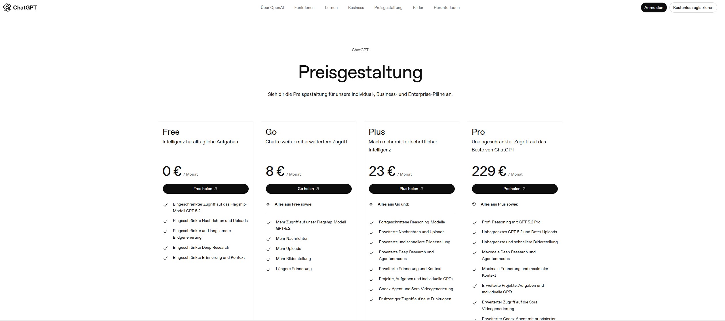 Nur wenn du Reasoning (GPT-5.2 Thinking), Deep Research oder Sora-Videos brauchst. Für reine Textaufgaben – E-Mails, Zusammenfassungen, einfache Fragen – reicht Go mit dem unlimitierten GPT-5.2 Instant völlig aus.