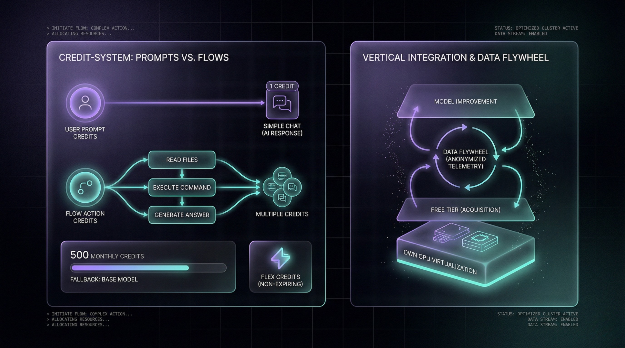 Flow Action Credits werden bei komplexen agentischen Aktionen fällig. Wenn Cascade drei Dateien liest, einen Terminalbefehl ausführt und dann eine Antwort generiert, kostet das mehrere Flow Credits.