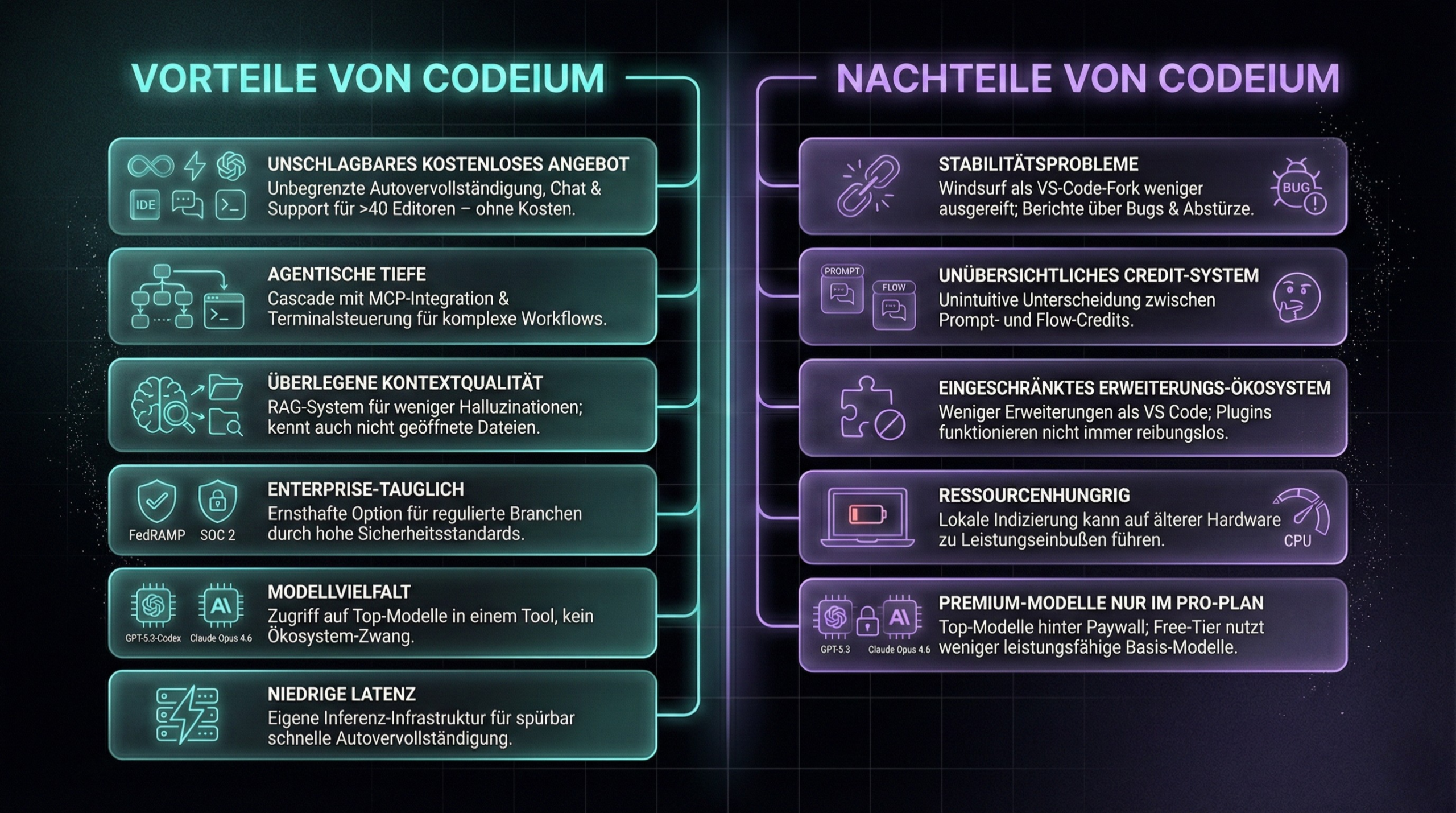 Codeium ist die Plugin-Marke für bestehende Editoren (VS Code, JetBrains etc.). Windsurf ist die eigenständige IDE mit agentischen Features wie Cascade, Terminal-Autonomie und Deep Context. Beides kommt vom selben Unternehmen.