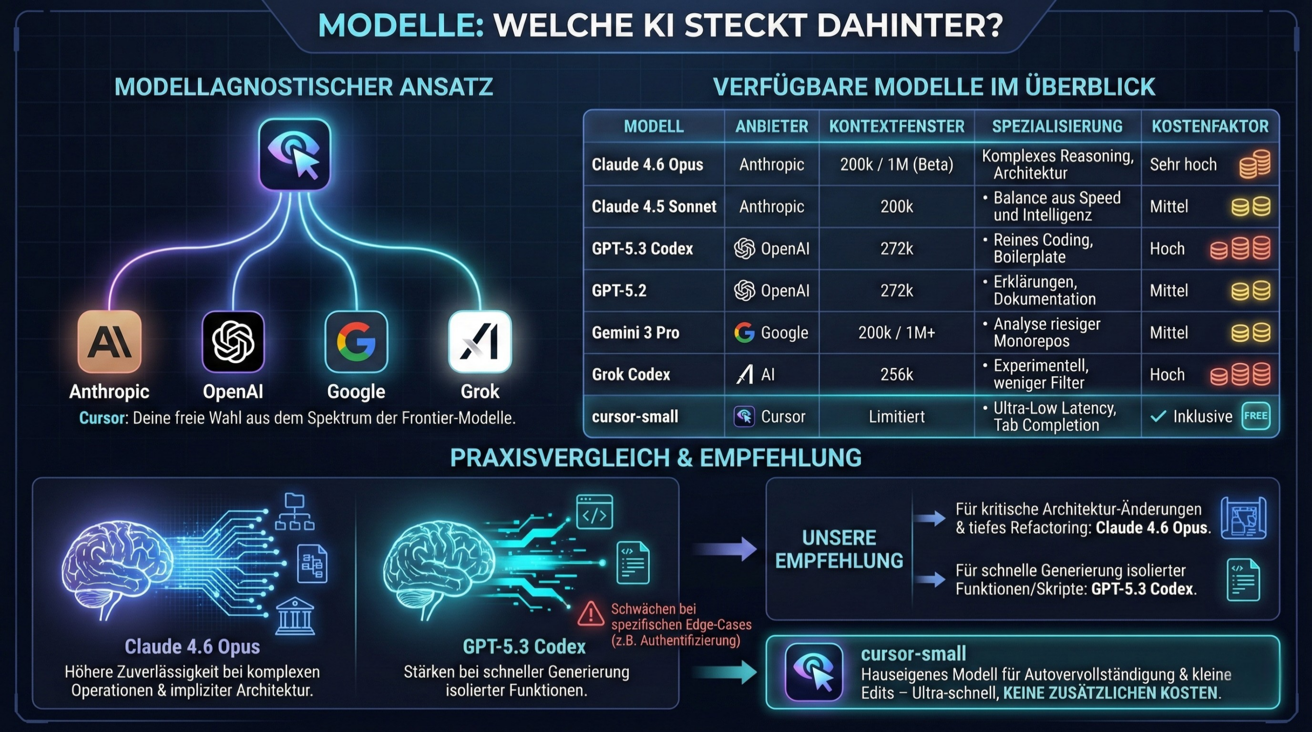 Die Modellagnostik gibt Freiheit. Du bist nicht an ein einzelnes Modell gekettet, sondern wählst je nach Aufgabe das Beste. Claude 4.6 Opus für Architektur, GPT-5.3 für schnelle Skripte, cursor-small für den Alltag.
