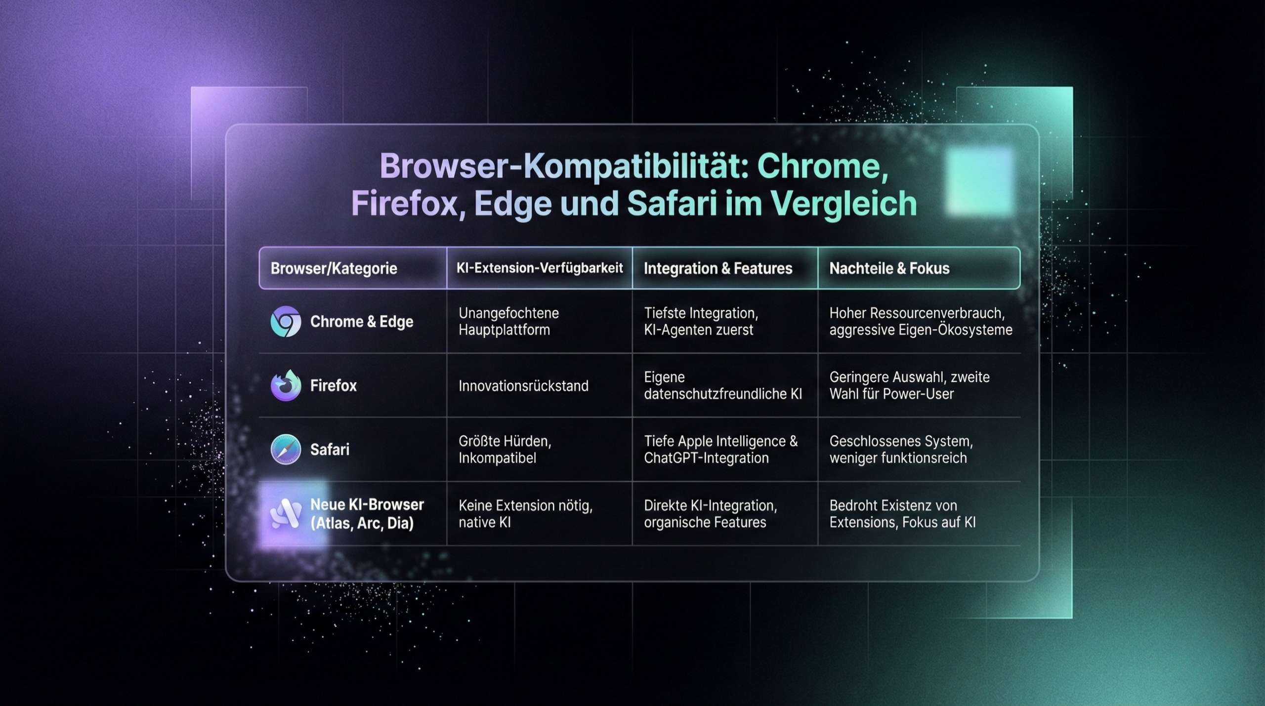 Chromium-basierte Browser sind die unangefochtene Hauptplattform für KI-Extensions. Nahezu alle neuen KI-Agenten erscheinen zuerst hier. Die technische Basis erlaubt die tiefste Integration von Sidebars und Hintergrundskripten.