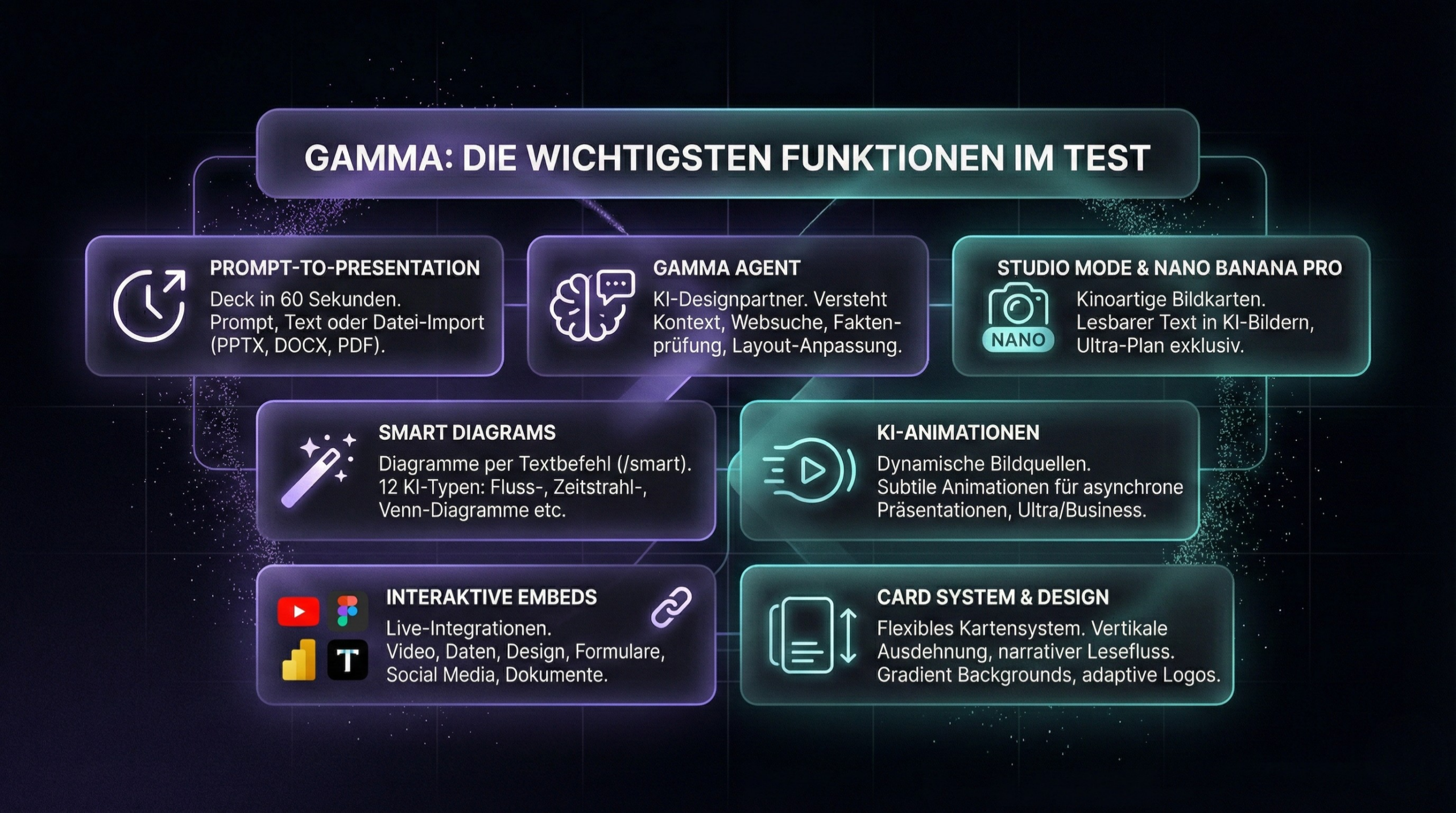 Gamma verwendet keine starren 16:9-Folien, sondern ein flexibles Kartensystem. Eine Karte ist ein Container, der sich vertikal ausdehnt – ähnlich wie Web-Bausteine in Notion oder WordPress. Du musst Texte nicht künstlich kürzen, um sie in eine Textbox zu zwängen.