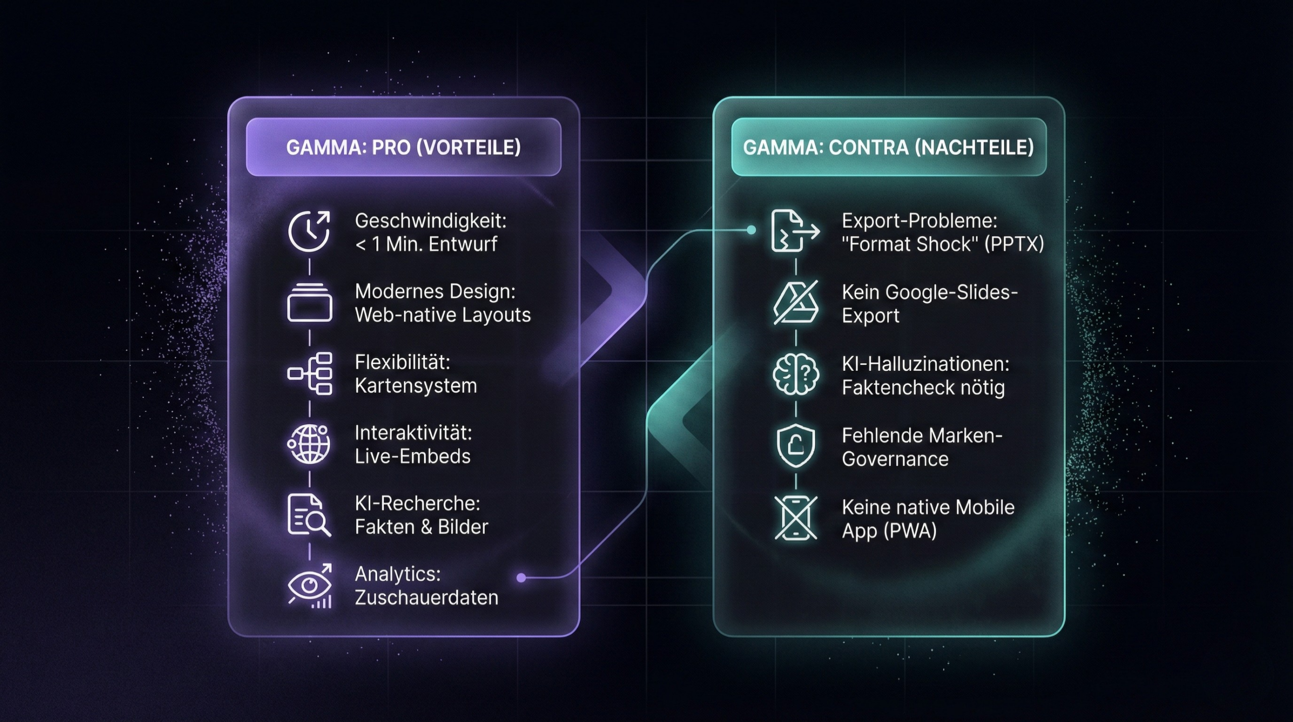 Das größte Hindernis bleibt der Export. Solange PowerPoint in vielen Unternehmen der Standard ist, bleibt Gamma für manche Teams eine Insellösung – brillant für die Ideenfindung, aber mit Reibungsverlusten auf dem Weg zurück ins Unternehmensformat.