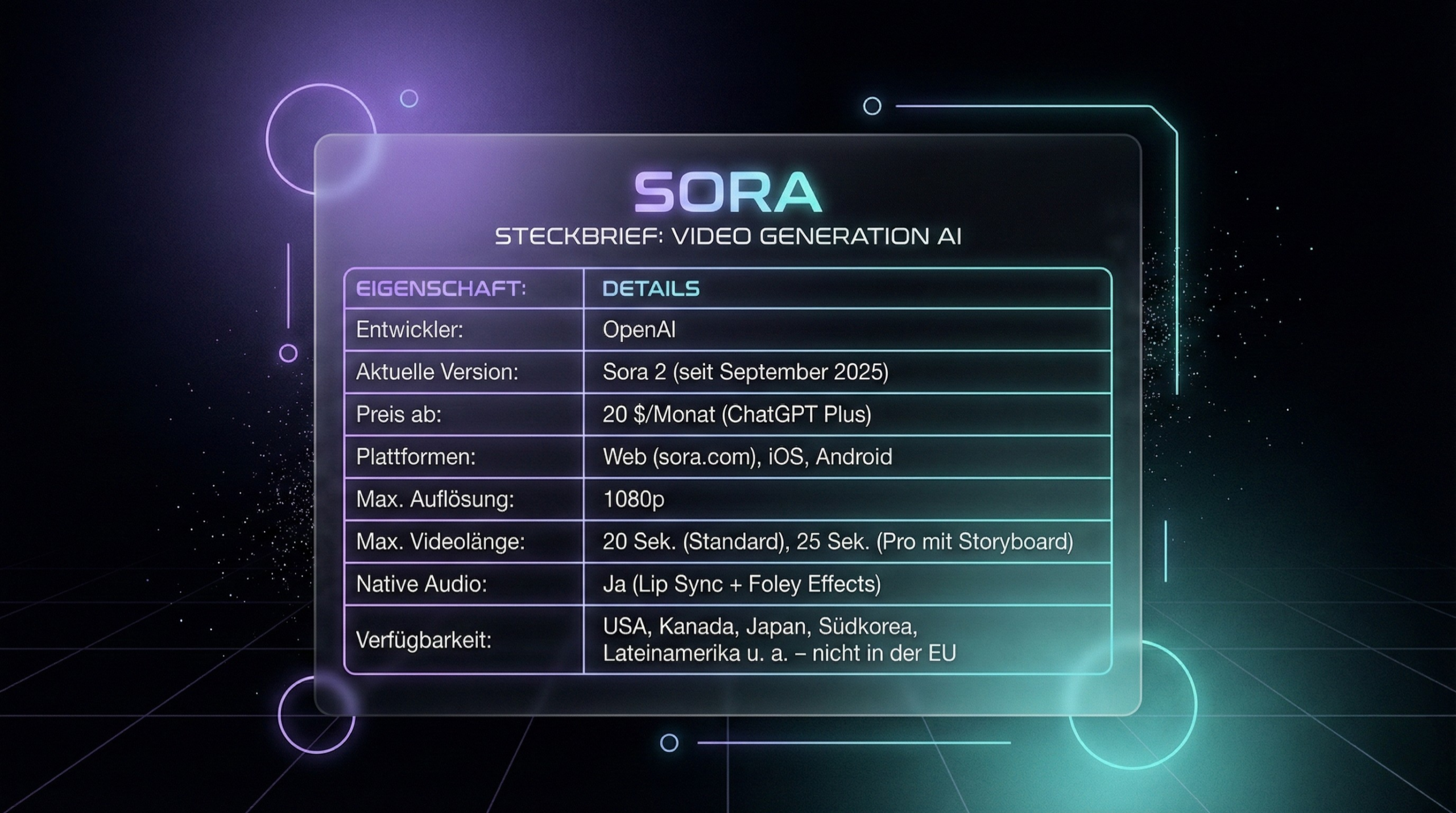 | ChatGPT Pro | 200 $/Monat | Sora 2 Pro | bis 1080p | 25 Sek. | 10× mehr als Plus |
