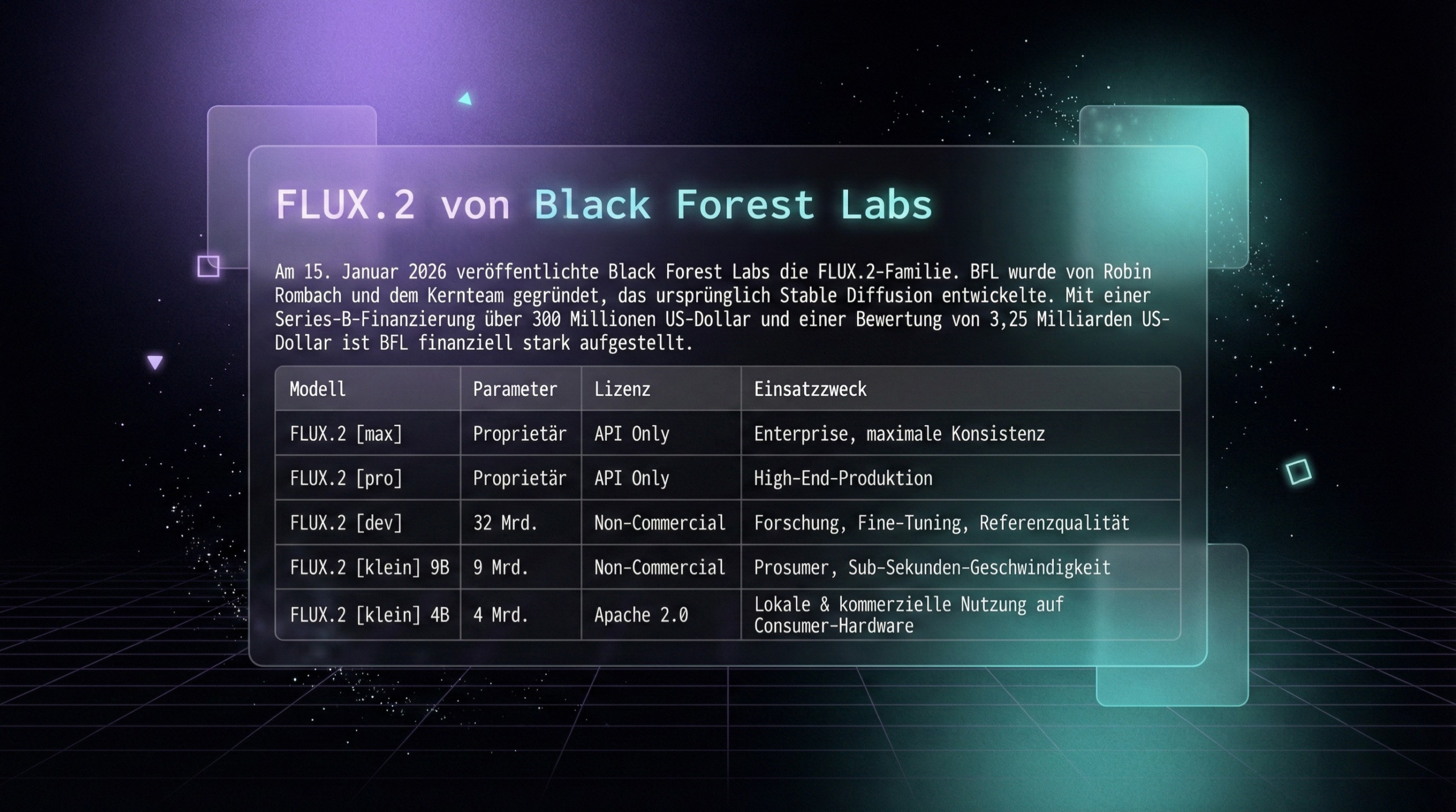 Am 15. Januar 2026 veröffentlichte Black Forest Labs die FLUX.2-Familie. BFL wurde von Robin Rombach und dem Kernteam gegründet, das ursprünglich Stable Diffusion entwickelte. Mit einer Series-B-Finanzierung über 300 Millionen US-Dollar und einer Bewertung von 3,25 Milliarden US-Dollar ist BFL finanziell stark aufgestellt.