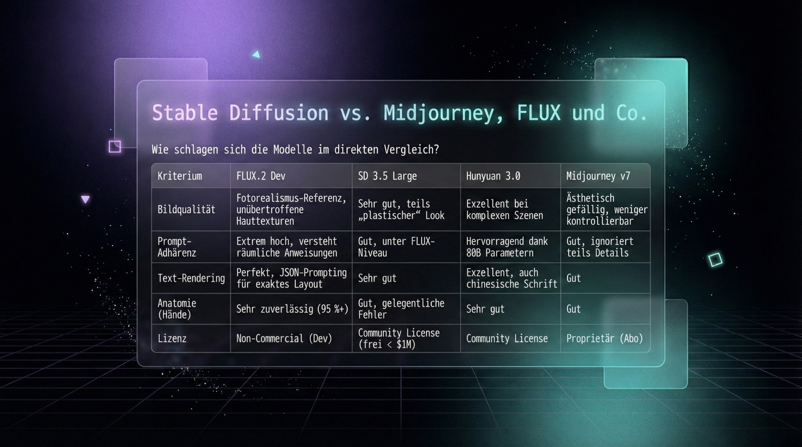 | Kriterium | FLUX.2 Dev | SD 3.5 Large | Hunyuan 3.0 | Midjourney v7 |