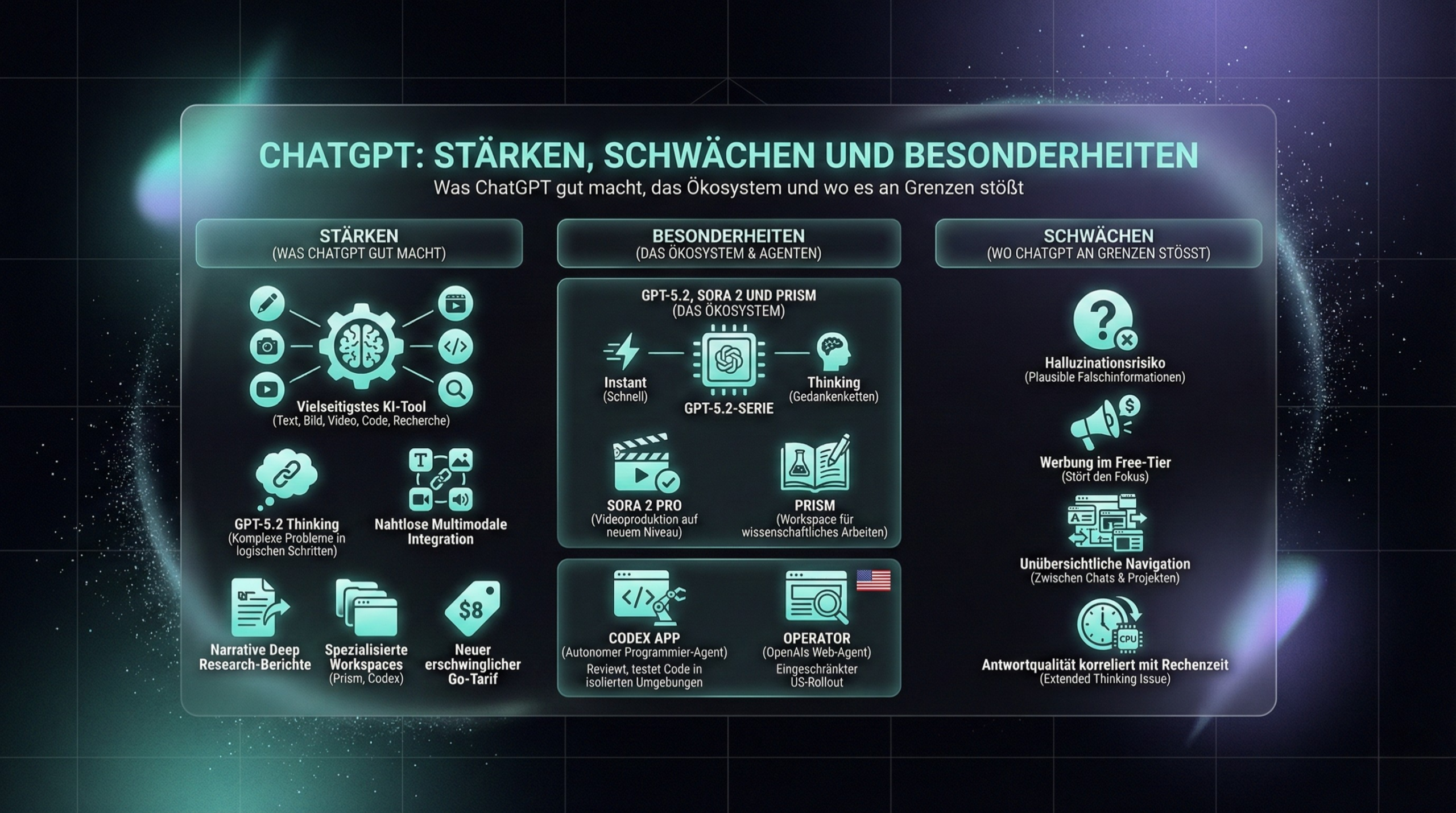 Die Stärken: GPT-5.2 Thinking zerlegt komplexe Probleme in logische Schritte. Die multimodale Integration (Text, Bild, Video, Sprache) ist nahtlos. Deep Research liefert narrative, kohärente Berichte. Die spezialisierten Workspaces (Prism, Codex) bieten maßgeschneiderte Umgebungen für Wissenschaft und Entwicklung. Und der neue Go-Tarif für $8 macht den Einstieg erschwinglich.