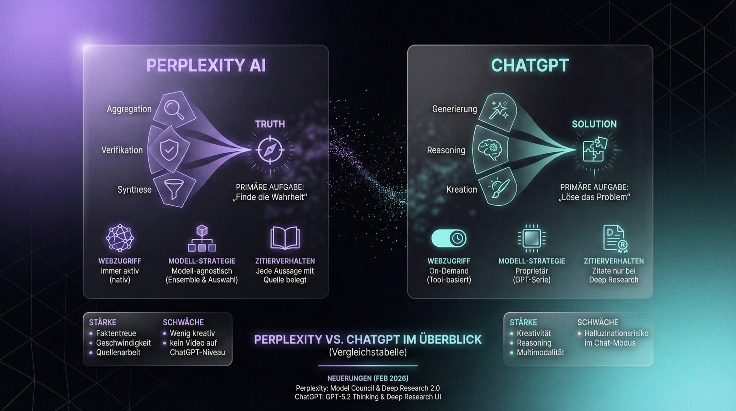 Die Schnittmenge zwischen beiden wird kleiner, die Spezialisierung tiefer. In einer idealen Welt nutzt du 2026 beides: Perplexity, um die Welt zu verstehen – und ChatGPT, um sie zu verändern.