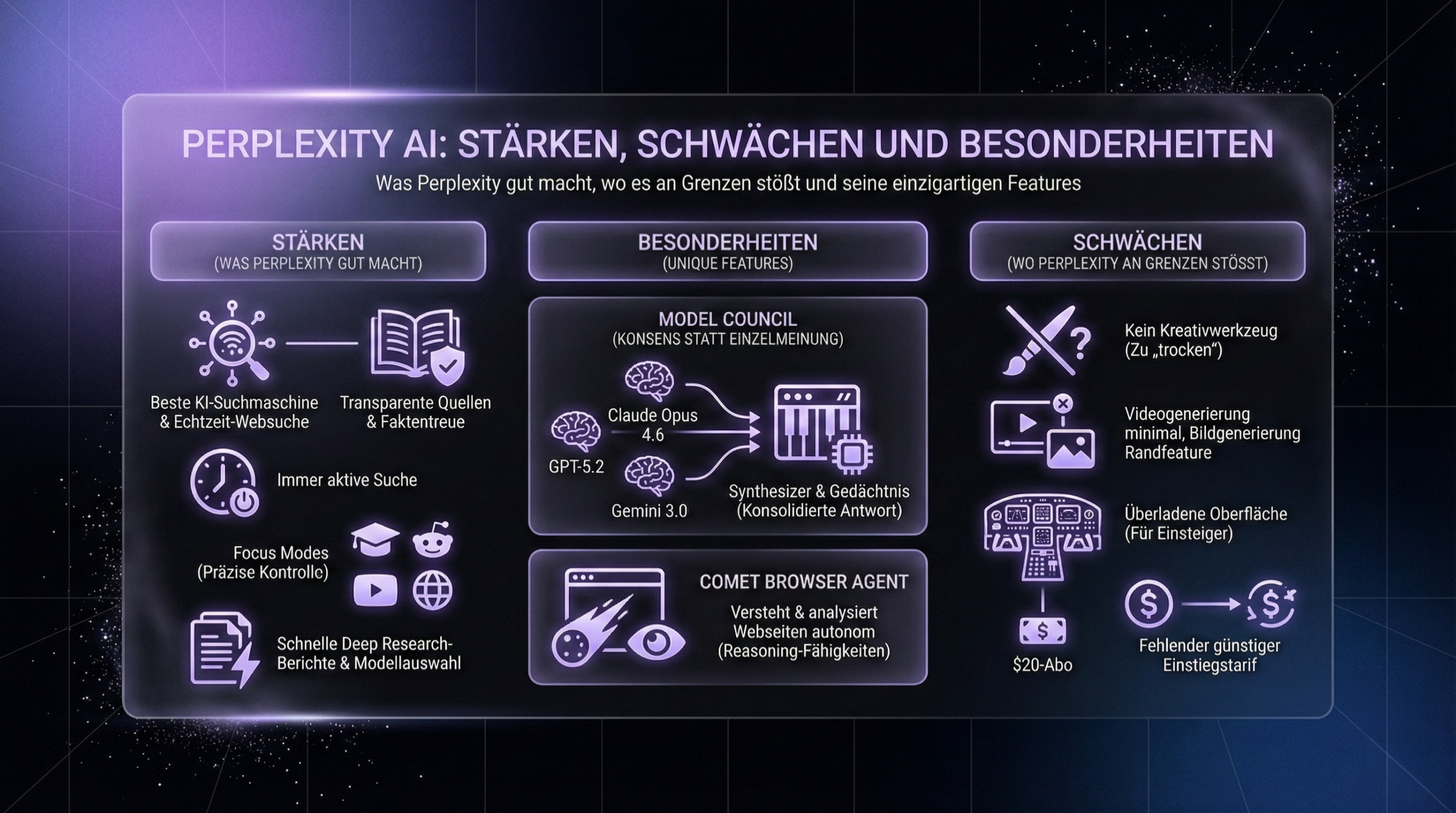 Die Stärken im Überblick: Jede Antwort ist quellenbasiert und überprüfbar. Die Suche läuft immer – du musst sie nicht manuell aktivieren. Die Focus Modes (Academic, Reddit, YouTube, Web) geben dir präzise Kontrolle. Die Deep Research-Berichte sind schnell und faktendicht. Und die Modellauswahl gibt dir Flexibilität, die kein anderes Tool bietet.